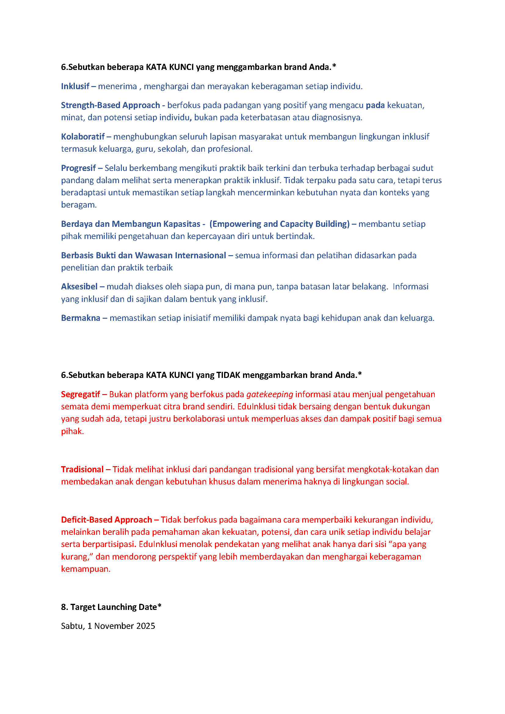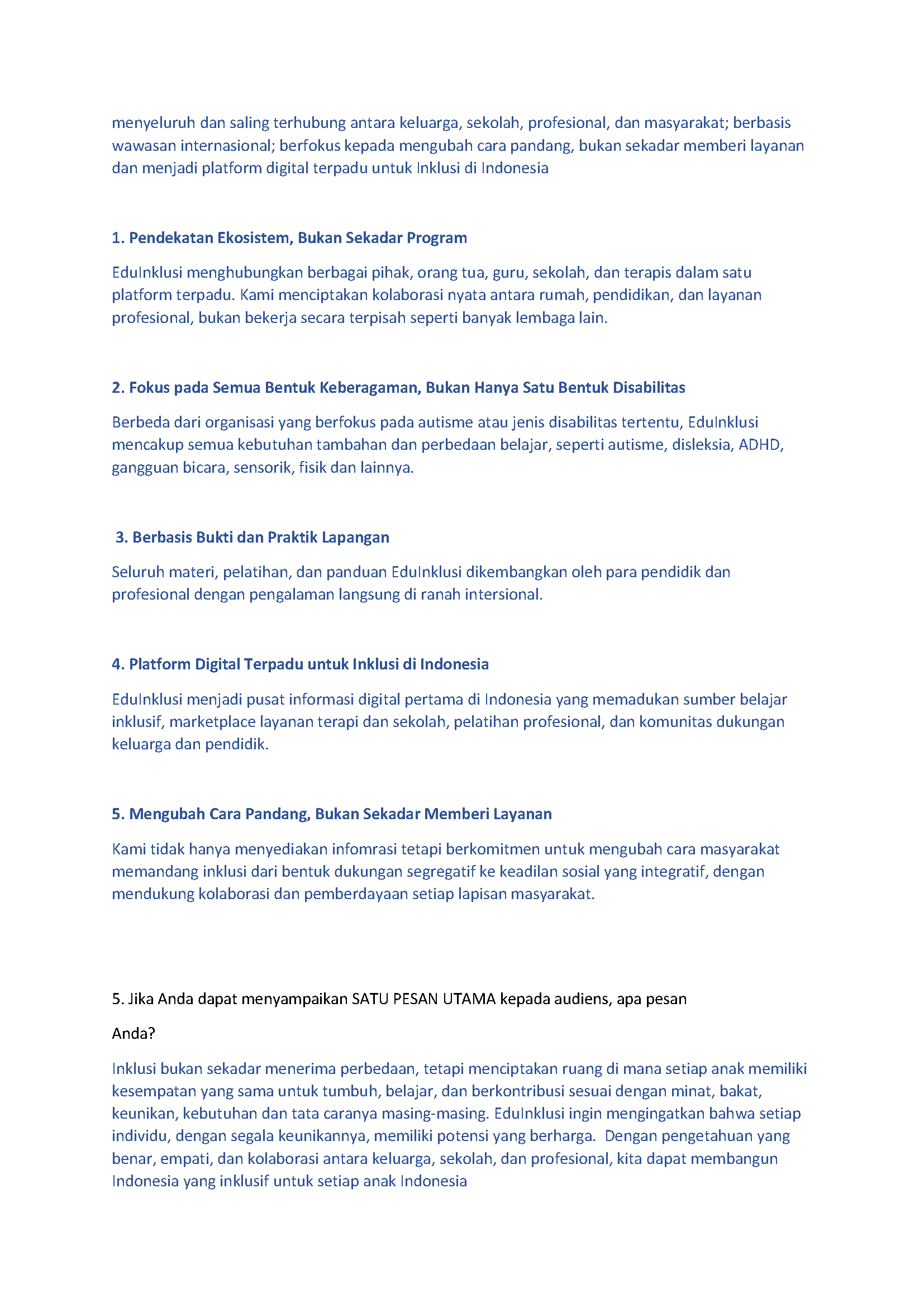 A few relevant keywords for EduInklusi's values are inclusivity, collaborationn, strength-based approach, progressive, and accessible. These values should be mindful of biased perspective of neurodivergent children still present in Indonesian society, such as segregative, traditional, and use deficit-based approach.