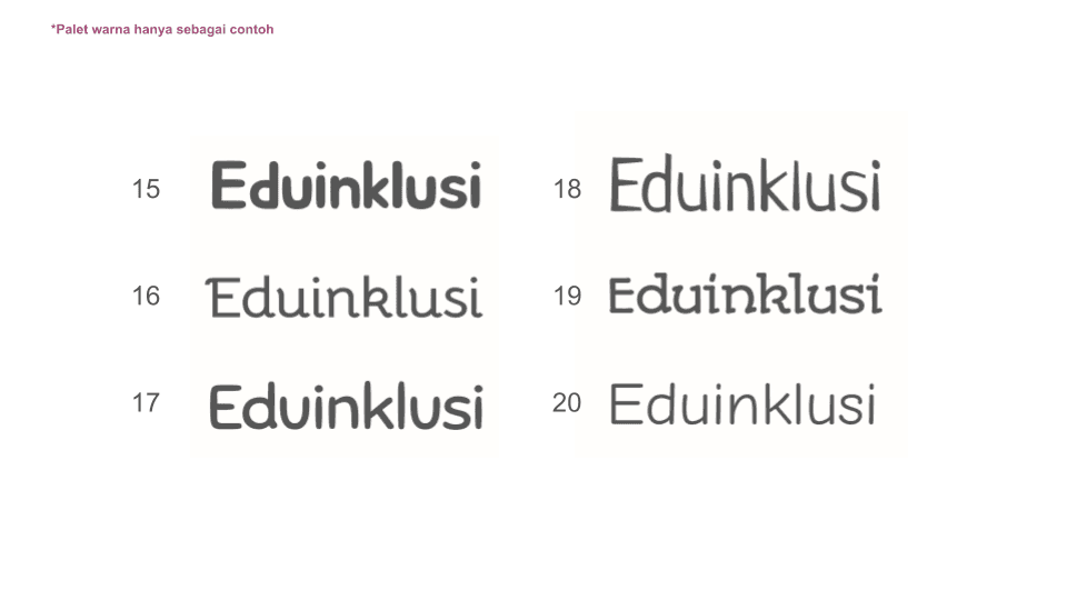 With the logogram ready, a supporting typography of "Eduinklusi" is appropriate. A selection of typefaces were experimented to complement the "flowing" characteristic of the logo, similar to the materiality of plasticine.