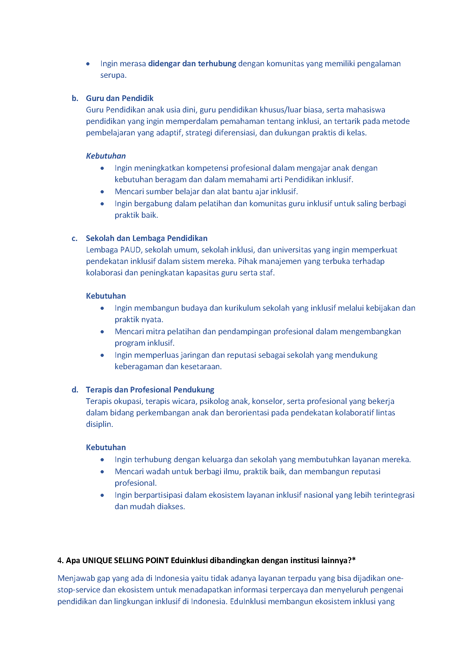 I investigated relevant Indonesian inclusive digital platforms already present in Indonesia. Most communities have centered their main audience with one specific demographic. I believe EduInklusi's diversified value could achieve its niche by providing for all inclusive services regardless of the child's unique disability.