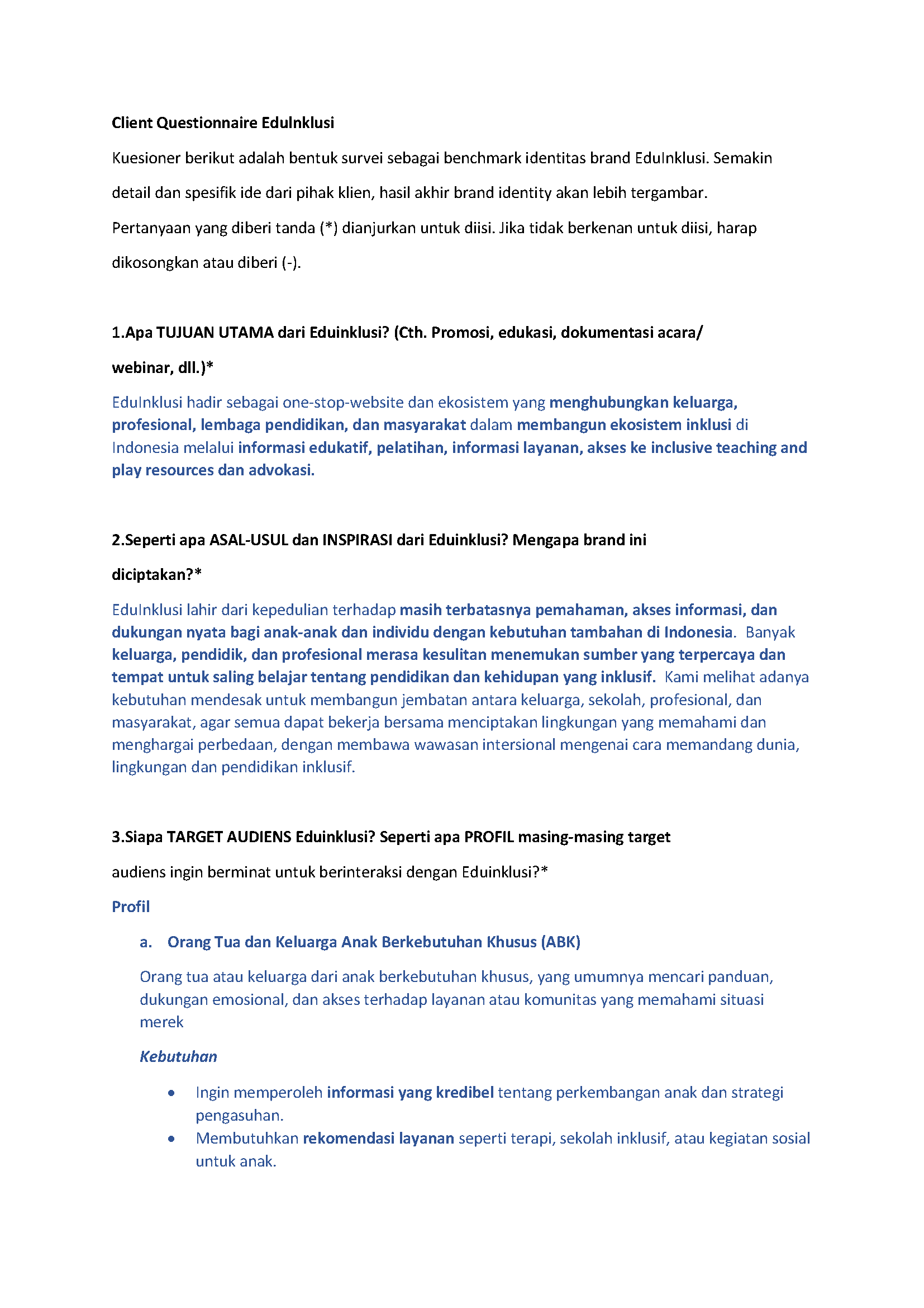 Below is the questionnaire given to the client in Bahasa Indonesia.
