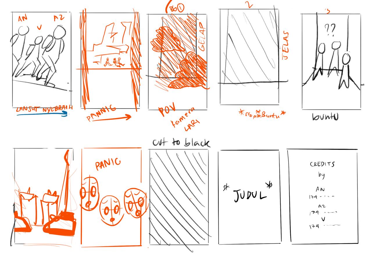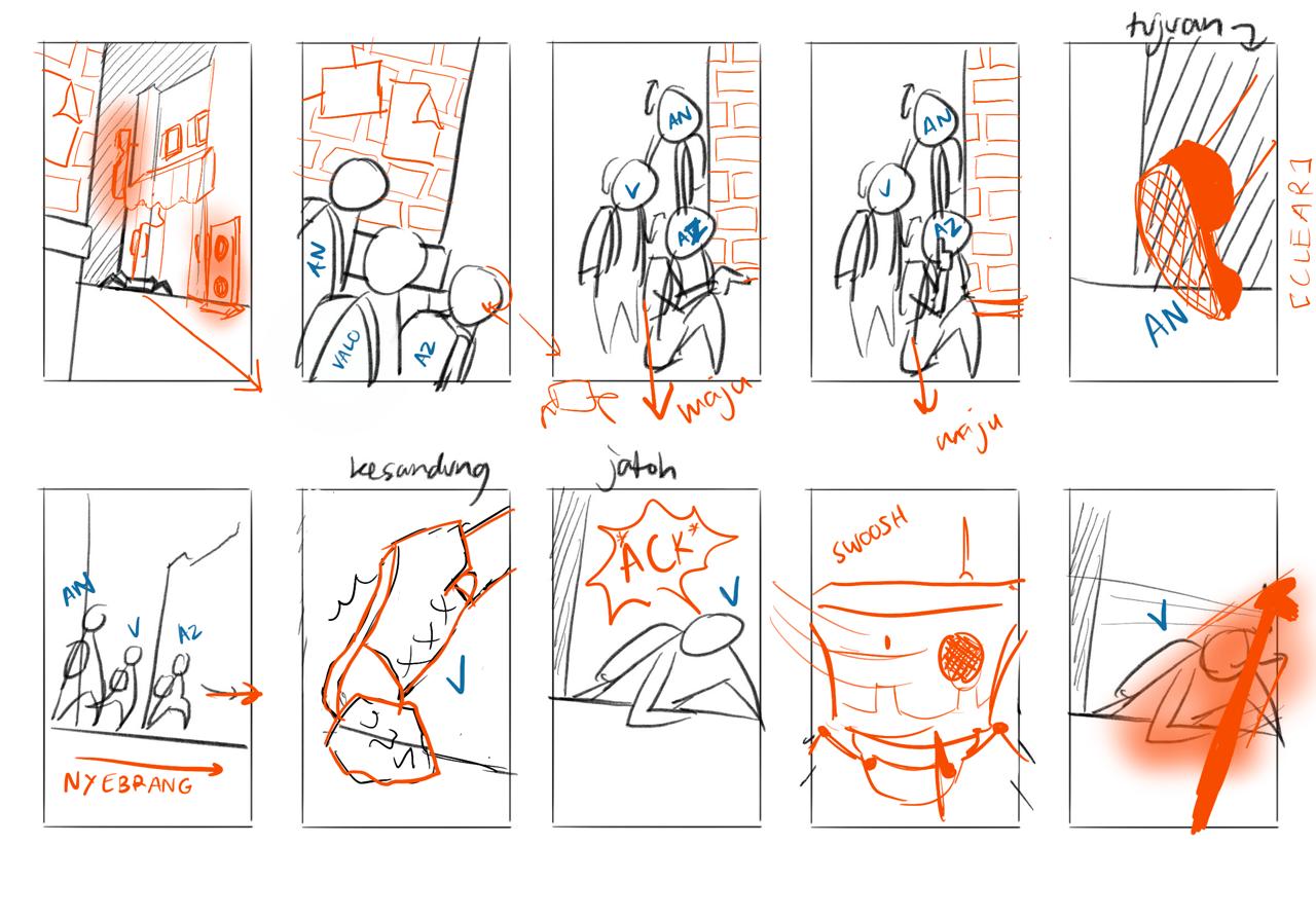 The storyboarding process takes into account photography angles of human subjects, parallax movement in backgrounds, and the allocation of music and sound effects. Storyboard was constructed to fit the one-minute duration, hence the showcased straightforward scenes.