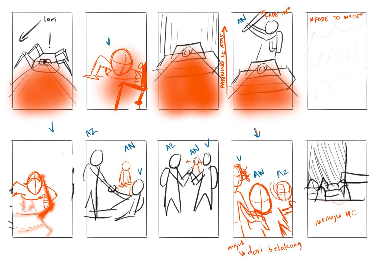 After the collaborative storyboarding process, overall visual development (by Saffanah) were done by attempting different color palettes and overall compositions. Animatics were compiled (by Avalo) and later aligned with custom sound design and soundtrack (by Andrea).