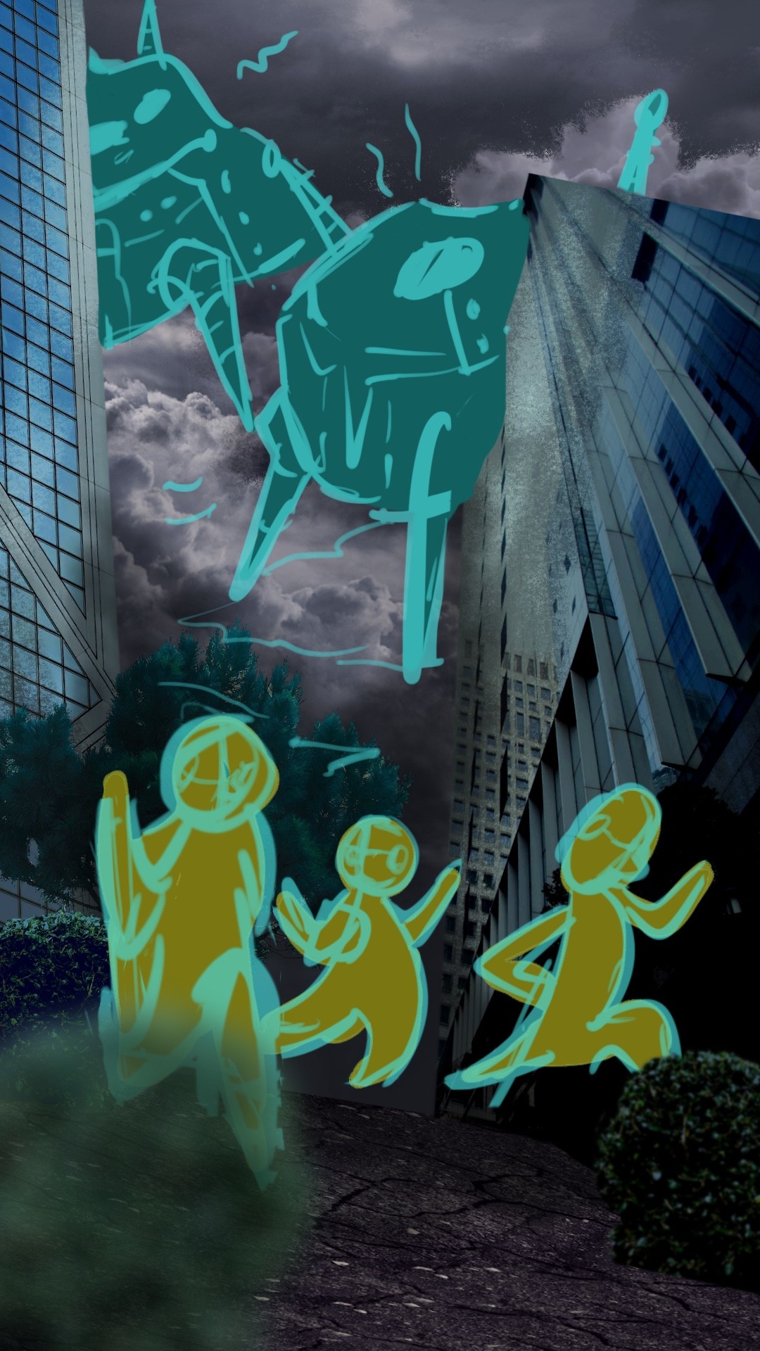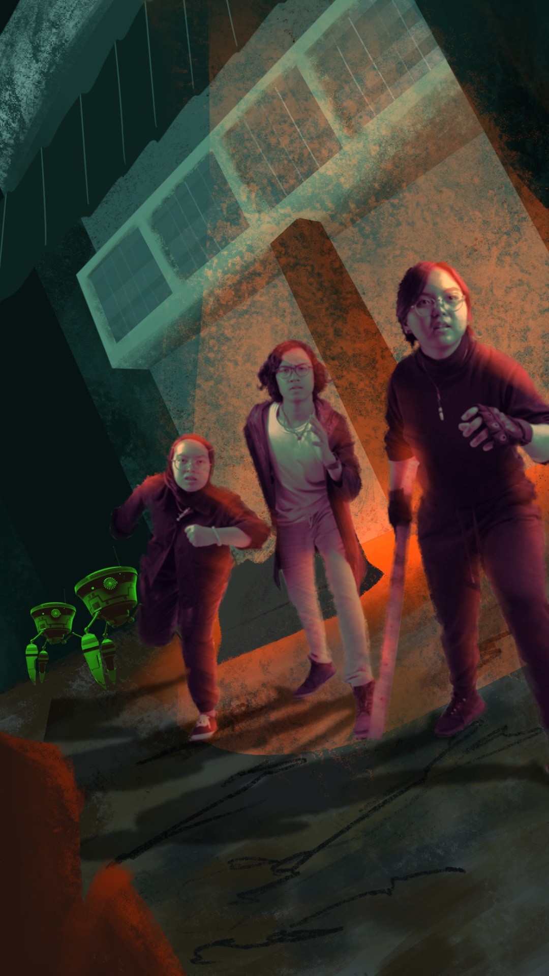 Exploration of visual development was initiated according to thriller, sci-fi, and dystopian themes. By finding the common threads between these genres, the team decides on incorporating illustrations and photography, for backgrounds and human subjects respectively, and later composited into ready-made layers for animation in After Effects.
