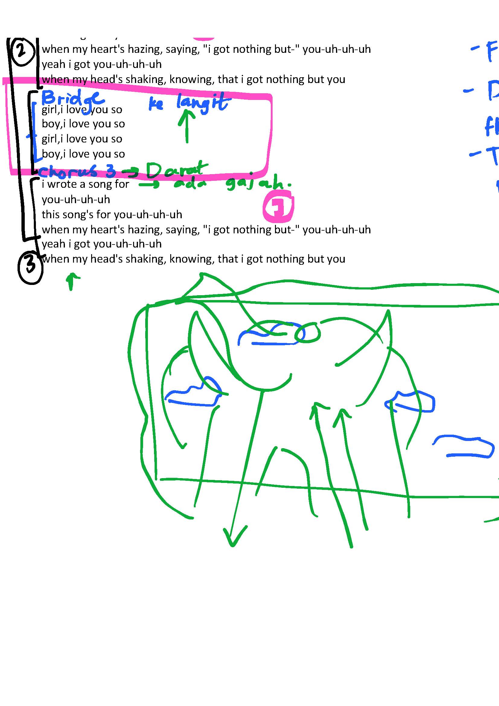 After the slight drop in hope, the chorus uplifts the mood with repetitive lyrics. It gave a huge boost of energy to the ambience. Lyrics of chorus 1 were emphasized by propelling into the direction of the audience, visualizing the new blast of hope the singers conveyed.